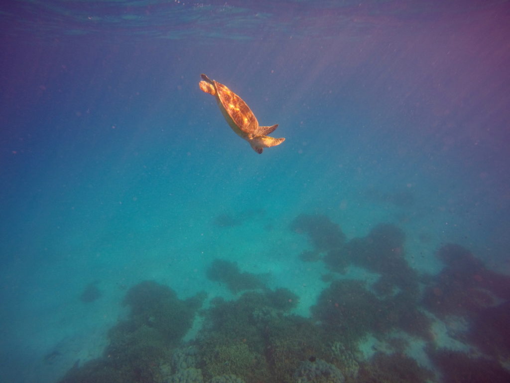Zurück auf dem Boot können wir schnorcheln gehen. Wir ankern gleich neben einer Schildkröten-Putzstation: Ein Teil des Riffs, wo die Schildkröten ihre Panzer von kleinen Fischen reinigen lassen. Auch Krill kommt her und putzt den Schildkröten die Zähne. Ab und zu taucht eine auf, um zu atmen. Es ist ein Highlight mit den gemütlichen Tieren zu schwimmen. Wenn sie sich fortbewegen, sehen sie aus als würden sie durch das klare Wasser schweben.