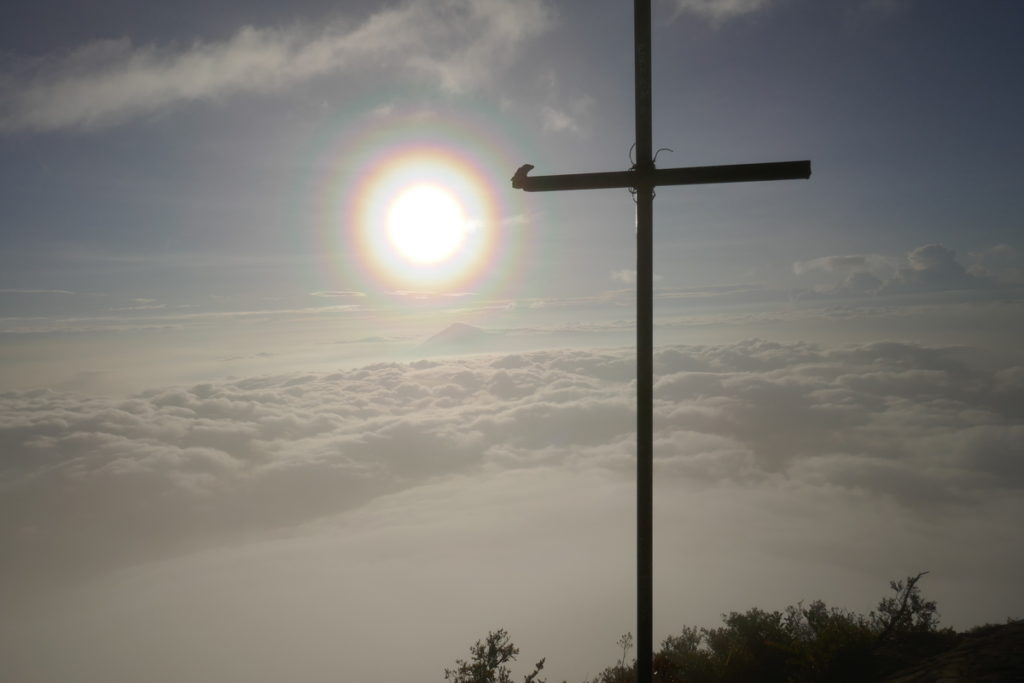Dino schreitet zügig voran. Er leuchtet mit der Taschenlampe seines Handys auf den Weg und spielt gleichzeitig Musik ab. Der Weg ist extrem steil und rutschig, da er aus losem Schotter aus Vulkangestein besteht. Schon bald brauche ich eine Pause. Als ich schnaufend hinter Dino her kraxle, frage ich mich, warum ich unbedingt hier heraufsteigen wollte. Nach etwa eineinhalb Stunden wird es plötzlich kalt: Wir haben die Wolken erreicht. Nebel hüllt uns ein und kriecht uns in die Kleider. Als Dino vorschlägt, nur zum unteren Kraterrand zu gehen statt zum Gipfel, lehne ich vehement ab. Wenn ich schon hier bin, will ich auf den richtigen Gipfel. Nach insgesamt zweieinhalb Stunden erreichen wir ihn. Wir setzen uns hinter einen Hügel, um uns vor dem starken Wind zu schützen, der über den Kraterrand bläst. Dino bietet mir Kaffee aus der Thermoskanne an. Er ist süss und heiss und ich denke, dass mir selten Kaffee so gut geschmeckt hat.